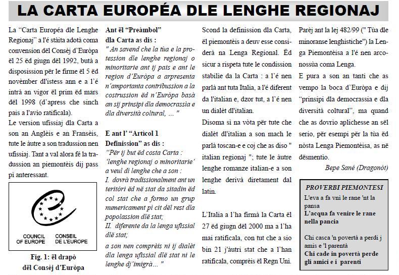"An savend che la tła e la protession dle lenghe regionaj o minoritarie ant ij pais e ant le
